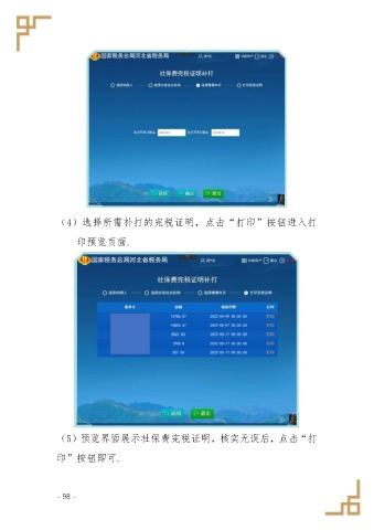 (4)选择所需补打的完税证明,点击“打印”按钮进入打 印预览页面. (5)预览界面展示社保费完税证明,核实无误后,点击“打 印”按钮即可. - 98 -