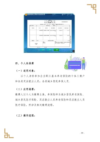 四、个人社保费 (一)适用对象: 以个人身份参加企业职工基本养老保险的个体工商户 和各类灵活就业人员;各类城乡居民参保人员. (二)应用场景: 缴费人以个人为缴费主体,参保险种为城乡居民养老保险、 城乡居民医疗保险、灵活就业人员养老保险和灵活就业人员 医疗保险,所涉及相关缴费流程。 (三)操作流程: - 99 -