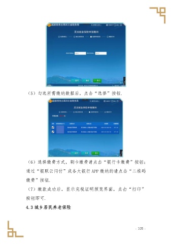 (5)勾选所需缴纳数据后,点击“选择”按钮. (6)选择缴费方式,刷卡缴费请点击“银行卡缴费”按钮; 通过“银联云闪付”或各大银行 APP 缴纳的请点击“二维码 缴费”按钮. (7)缴款成功后,显示完税证明预览界面,点击“打印” 按钮即可. 4.3 城乡居民养老保险 - 105 -