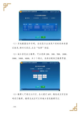 (1)系统根据证件号码,自动显示出该用户所有的参保登 记信息,核对无误后,点击“选择”按钮. (2)城乡居民自主缴费,可以选择 200、300、500、1000、 3000、5000、8000,共 7 个档次,选择后跳转至缴费界面. (3)缴费人可通过云闪付、各大银行 APP、微信或支付宝扫 码进行缴费,缴费完成后可打印城乡居民缴费凭证. - 106 -