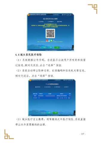 4.4 城乡居民医疗保险 (1)系统根据证件号码,自动显示出该用户所有的参保登 记信息,核对无误后,点击“选择”按钮. (2)系统自动带出险种名称、社保编码和征收机关等信息, 核对无误后,点击“选择”按钮. (3)城乡医疗自主缴费:通常缴纳次年医疗保险,系统直接 带出本年度需缴纳的金额. - 107 -