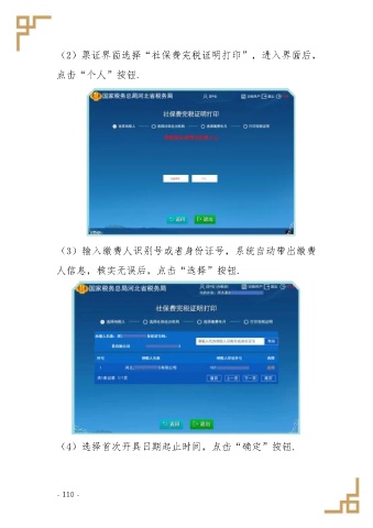 (2)票证界面选择“社保费完税证明打印”,进入界面后, 点击“个人”按钮. (3)输入缴费人识别号或者身份证号,系统自动带出缴费 人信息,核实无误后,点击“选择”按钮. (4)选择首次开具日期起止时间,点击“确定”按钮. - 110 -