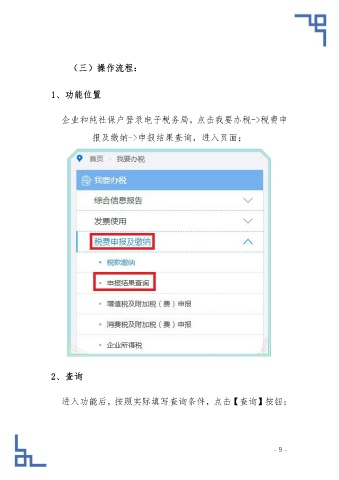 (三)操作流程: 1、功能位置 企业和纯社保户登录电子税务局,点击我要办税->税费申 报及缴纳->申报结果查询,进入页面; 2、查询 进入功能后,按照实际填写查询条件,点击【查询】按钮; - 9 -