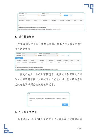3、提交提前缴费 根据查询条件查询已缓缴记录后,单击“提交提前缴费” 按钮提交申请。 提交成功后,系统如下图提示,缴费人后续可通过“单 位社会保险费申报(人社核定)”功能申报。同时请注意此 功能将查询不到已提交的缓缴记录。 4、社会保险费申报 功能路径: 企业/纯社保户登录->我要办税->税费申报及 - 15 -