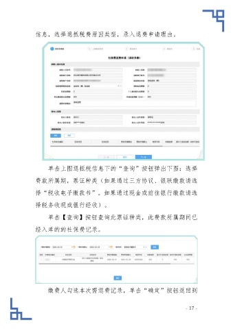 信息,选择退抵税费原因类型,录入退费申请理由。 单击上图退抵税信息下的“查询”按钮弹出下图:选择 费款所属期,票证种类(如果通过三方协议、银联缴款请选 择“税收电子缴款书”。如果通过现金或前往银行缴款请选 择税务收现或银行经收)。 单击【查询】按钮查询此票证种类,此费款所属期间已 经入库的的社保费记录。 缴费人勾选本次需退费记录,单击“确定”按钮返回到 - 17 -