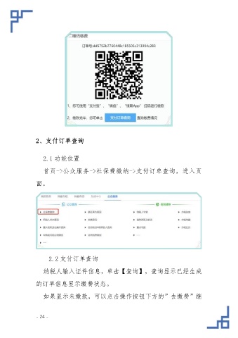 2、支付订单查询 2.1 功能位置 首页->公众服务->社保费缴纳->支付订单查询,进入页 面。 2.2 支付订单查询 纳税人输入证件信息,单击【查询】,查询显示已经生成 的订单信息显示缴费状态。 如果显示未缴款,可以点击操作按钮下方的”去缴费”继 - 24 -
