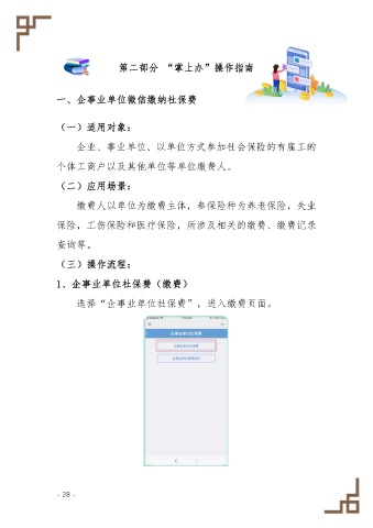 第二部分 “掌上办”操作指南 一、企事业单位微信缴纳社保费 (一)适用对象: 企业、事业单位、以单位方式参加社会保险的有雇工的 个体工商户以及其他单位等单位缴费人。 (二)应用场景: 缴费人以单位为缴费主体,参保险种为养老保险,失业 保险,工伤保险和医疗保险,所涉及相关的缴费、缴费记录 查询等。 (三)操作流程: 1、企事业单位社保费(缴费) 选择“企事业单位社保费”,进入缴费页面。 - 28 -