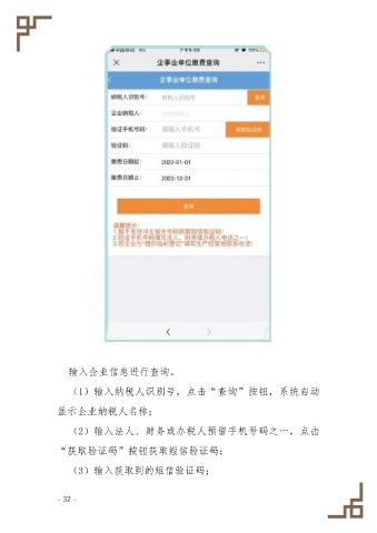 输入企业信息进行查询。 (1)输入纳税人识别号,点击“查询”按钮,系统自动 显示企业纳税人名称; (2)输入法人、财务或办税人预留手机号码之一,点击 “获取验证码”按钮获取短信验证码; (3)输入获取到的短信验证码; - 32 -