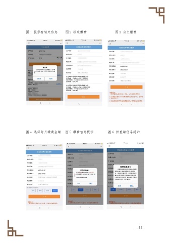 图 1 提示有核定信息 图 2 核定缴费 图 3 自主缴费 图 4 选择每月缴费金额 图 5 缴费信息提示 图 6 补差额信息提示 - 39 -