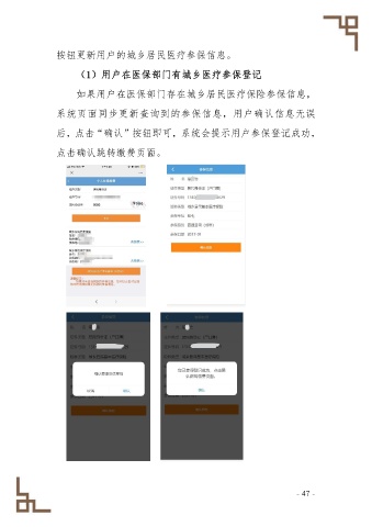 按钮更新用户的城乡居民医疗参保信息。 (1)用户在医保部门有城乡医疗参保登记 如果用户在医保部门存在城乡居民医疗保险参保信息, 系统页面同步更新查询到的参保信息,用户确认信息无误 后,点击“确认”按钮即可,系统会提示用户参保登记成功, 点击确认跳转缴费页面。 - 47 -