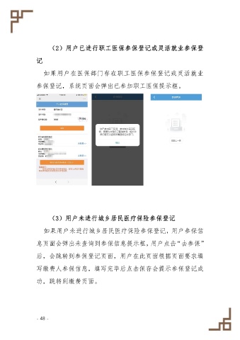 (2)用户已进行职工医保参保登记或灵活就业参保登 记 如果用户在医保部门存在职工医保参保登记或灵活就业 参保登记,系统页面会弹出已参加职工医保提示框。 (3)用户未进行城乡居民医疗保险参保登记 如果用户未进行城乡居民医疗保险参保登记,用户参保信 息页面会弹出未查询到参保信息提示框,用户点击“去参保” 后,会跳转到参保登记页面,用户在此页面根据页面要求填 写缴费人参保信息,填写完毕后点击保存会提示参保登记成 功,跳转到缴费页面。 - 48 -