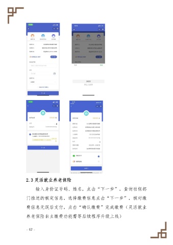 2.3 灵活就业养老保险 输入身份证号码、姓名,点击“下一步”,查询社保部 门推送的核定信息,选择缴费信息点击“下一步”,核对缴 费信息无误后支付,点击“确认缴费”完成缴费(灵活就业 养老保险自主缴费功能需等后续程序升级上线) - 62 -