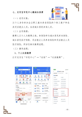 七、支付宝市民中心缴纳社保费 (一)适用对象: 以个人身份参加企业职工基本养老保险的个体工商户和各 类灵活就业人员;各类城乡居民参保人员。 (二)应用场景: 缴费人以个人为缴费主体,参保险种为城乡居民养老保险、 城乡居民医疗保险、灵活就业人员养老保险和灵活就业人员 医疗保险,所涉及相关缴费流程。 (三)操作流程: 1、个人社保缴费 打开支付宝“市民中心”→“社保”→“社保缴费”。 - 65 -