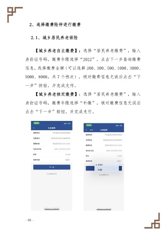 2、选择缴费险种进行缴费 2.1、城乡居民养老保险 【城乡养老自主缴费】:选择“居民养老缴费”,输入 身份证号码,缴费年限选择“2022”,点击下一步查询缴费 信息,选择缴费金额(可以选择 200、300、500、1000、3000、 5000、8000,共 7 个档次),核对缴费信息无误后点击“下 一步”按钮,并完成支付。 【城乡养老核定缴费】:选择“居民养老缴费”,输入 身份证号码,缴费年限选择“补缴”,核对缴费信息无误后 点击“下一步”按钮,并完成支付。 - 66 -