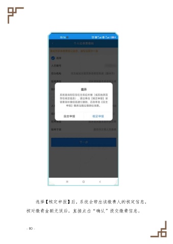 选择【核定申报】后,系统会带出该缴费人的核定信息, 核对缴费金额无误后,直接点击“确认”提交缴费信息。 - 80 -