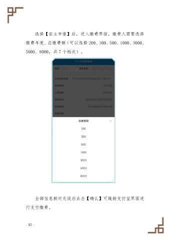 选择【自主申报】后,进入缴费界面,缴费人需要选择 缴费年度、应缴费额(可以选择 200、300、500、1000、3000、 5000、8000,共 7 个档次)。 全部信息核对无误后点击【确认】可跳转支付宝界面进 行支付缴费。 - 82 -