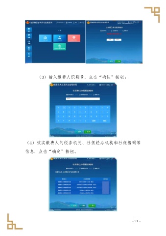 (3)输入缴费人识别号,点击“确认”按钮; (4)核实缴费人的税务机关、社保经办机构和社保编码等 信息,点击“确定”按钮。 - 91 -