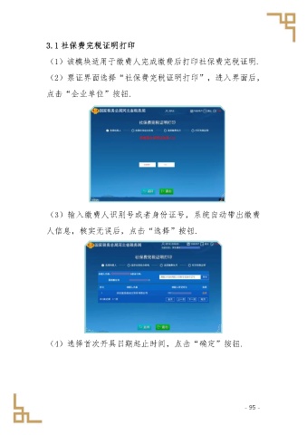 3.1 社保费完税证明打印 (1)该模块适用于缴费人完成缴费后打印社保费完税证明. (2)票证界面选择“社保费完税证明打印”,进入界面后, 点击“企业单位”按钮. (3)输入缴费人识别号或者身份证号,系统自动带出缴费 人信息,核实无误后,点击“选择”按钮. (4)选择首次开具日期起止时间,点击“确定”按钮. - 95 -