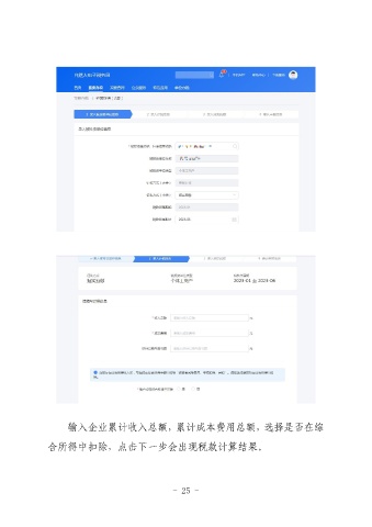 输入企业累计收入总额,累计成本费用总额,选择是否在综 合所得中扣除,点击下一步会出现税款计算结果。 - 25 -