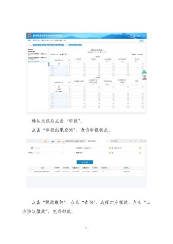 确认无误后点击“申报”。 点击“申报结果查询”,查询申报状态。 点击“税款缴纳”,点击“查询”,选择对应税款,点击“三 方协议缴款”,完成扣款。 - 6 -
