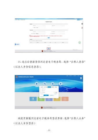 15.退出后重新登录河北省电子税务局,选择“自然人登录” (以法人身份信息登录)。 或使用新版河北省电子税务局登录界面,选择“自然人业务” (以法人身份登录) —8 —