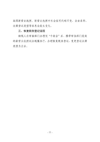 取得新营业执照。新营业执照中社会信用代码不变,企业名称、 注册登记类型等信息会发生变化。 三、恢复税务登记流程 纳税人在审批部门办理完“个转企”后,携带审批部门发放 的新营业执照到办税服务厅,办理恢复税务登记,变更登记注册 类型为企业。 —11 —
