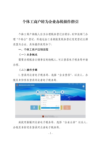 个体工商户转为企业办税操作指引 个体工商户纳税人应当办理税务登记注销后,到审批部门办 理“个转企”登记,再通过金三系统恢复税务登记变更登记注册 类型为企业。具体操作流程如下: 一、个体工商户注销流程 (一)业务概述 需要办理税务注销事宜的纳税人,可以登录电子税务局申请 办理。 (二)操作步骤 1.登录河北省电子税务局,选择“企业登录”,以法人、办 税员身份实名登录河北省电子税务局。 或使用新版河北省电子税务局,选择“企业业务”以法人、 办税员身份实名登录河北省电子税务局。 —1 —